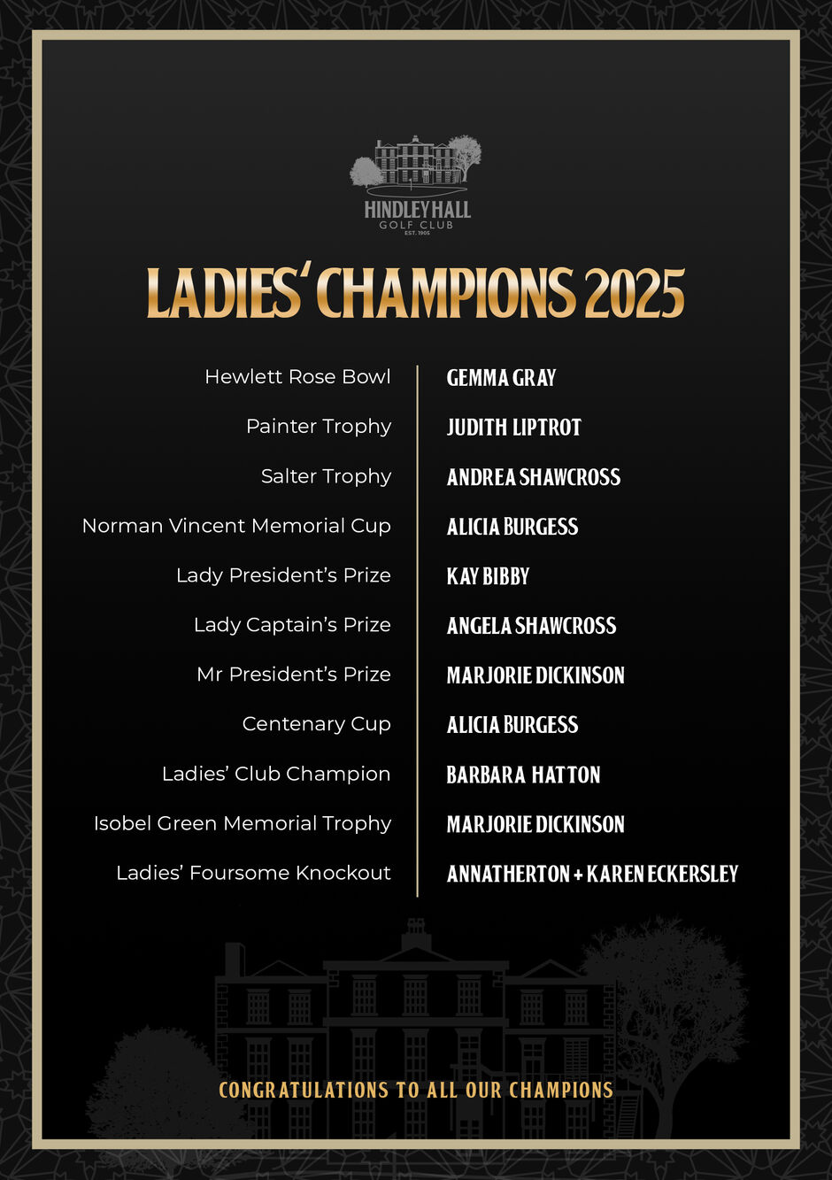 The Board of Champions recognises the outstanding achievements of our members throughout the 2025 season. From Men’s and Ladies’ competitions to the next generation of Junior champions, this page celebrates those whose dedication, skill, and commitment to the game have defined the year at Hindley Hall Golf Club.